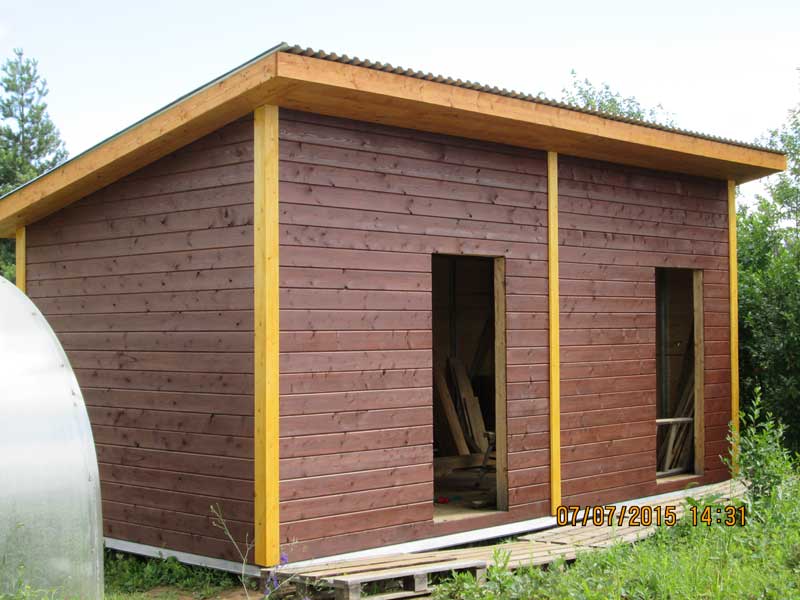 - Добить досками фронтальную стену слева и внутреннюю перегородку между дровяником и мастерской.